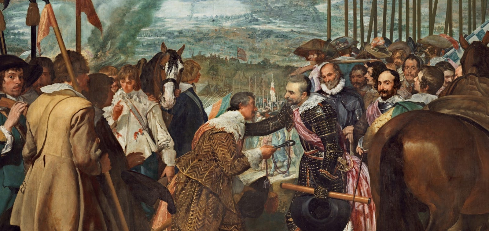 I guess bankers were also compensated with noble titles2 and estates, or advantageous marriages for their sons and daughters. For example, Catharina Welser, the daughter of a famous German banking family called the Welsers, married an archduke who was the second son of an emperor. The Genoese banking family Spinola lent huge sums to Philip, and thus a scion of the family, Ambrogio Spinola was a marquis and became the supreme commander of the Spanish troops in the Netherlands. He is depicted in Velazquez’s painting The Fall of Breda, also called Las Lanzas (the Lances). He is the magnanimous guy in the middle. The other one offering him the key to the city in surrender is Justinus van Nassau, a long-deceased relative of the present Dutch king Willem-Alexander.